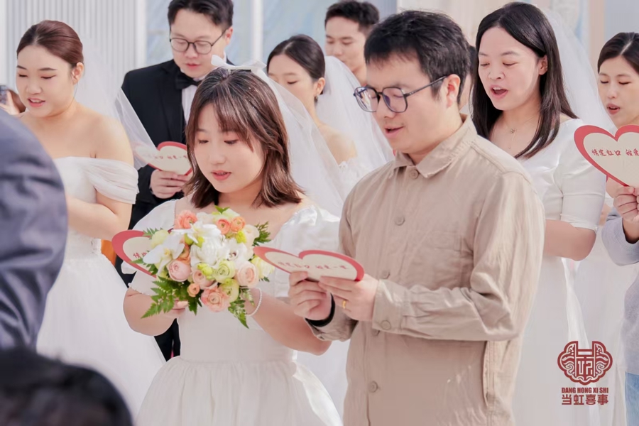 去年今日是王亦可和赵雨稼在甜爱婚姻登记中心领证的日子。之前,王亦可在公众号看到招募集体婚礼的信息,马上报了名,并主动提出把在自己婚礼上演唱的《爱一点》带到今天的现场。王亦可说,由于这次招募的是过去两年内在此领证的夫妻,这场集体婚礼带给她最大的触动,是可以看到年轻爱侣们的不同状态和相处模式——有人刚踏入婚姻殿堂,有人已带着孩子前来。这些婚姻的不同阶段,也让赵雨稼感慨“被婚姻改变了”——作为“i人(内向的人)”,如果时光倒退到一年多前,他完全无法想象自己会在那么多陌生人跟前唱歌。但磨合、尝试,恰是婚姻赋予他的成长,再次举办婚礼,也让他重温结婚时的初心,“继续相信自己和另一半,继续相信爱情”。